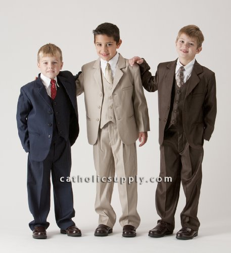 These high quality five piece suits are an incredible value at only $49.95! Includes: Jacket, Vest, Pants, Dress Shirt, and Matching Adjustable Tie. ****Also Available in Navy, Khaki, Dark Brown, Black, White, or Charcoal (Dark) Grey for $49.95 each by calling our main store (3 1 4) 6 4 4 - 0 6 4 3 or visiting the official Catholic Supply of St Louis website.****