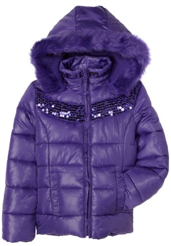 Girls 7-16 supershine jacket with sequin trimmed yoke. jacket and pockets are lined in plush coral fur for warmth.