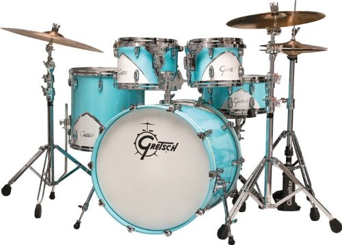 Drawing its inspiration from a Motor City classic cruiser, the Gretsch Renown 57 5-Piece Shell Pack with Throne puts you behind the wheel of some serious drumming mojo. This gorgeous 5-piece configuration consists of a 22" x 18" kick, 10" x 8" and 12" x 9" toms, 16" x 16" floor tom, and 14" x 6-1/2" matching snare. The "hood ornament" is the Renown Chevron, an aluminum triangular teardrop painted white with raised beveled chrome edges and embossed chrome Gretsch logo. Each drum has its own sized chevron, scaled to symmetrically fit that specific drum size. The eye-catching Motor City Blue is a traditional color derived from the 1950's car era. To further distinguish this drum set design, Gretsch Drums partnered with Gibraltar Hardware to produce a matching throne that will be included free with this kit for a limited time. Renown's contemporary features make this a modern classic. Renown 57 includes standard Renown maple specifications to produce punchy, full tones and rock solid performance. Toms are mounted from the bass drum on a Gretsch ball-socket double tom holder. In addition, the snare drum is equipped with 20 total lugs (10 lugs per side).The combination of the Motor City Blue and distinctive chevron design elements join with Renown's industry respected performance to produce a drum set that has an unmatched classic, contemporary and bold visual appearance. Cymbals and hardware sold separately