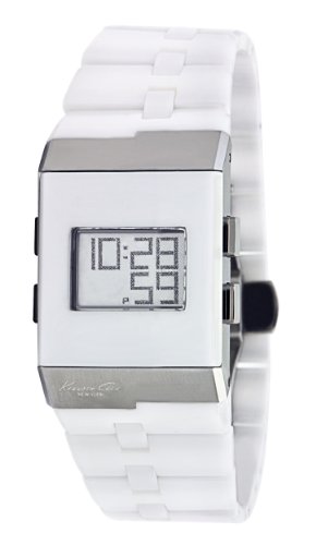 This Kenneth Cole digi-tech rectangle case shape from the digi-tech collection features: a white ceramic bezel, white LCD dial with day, date and year functions, full white ceramic bracelet and digital chronograph.